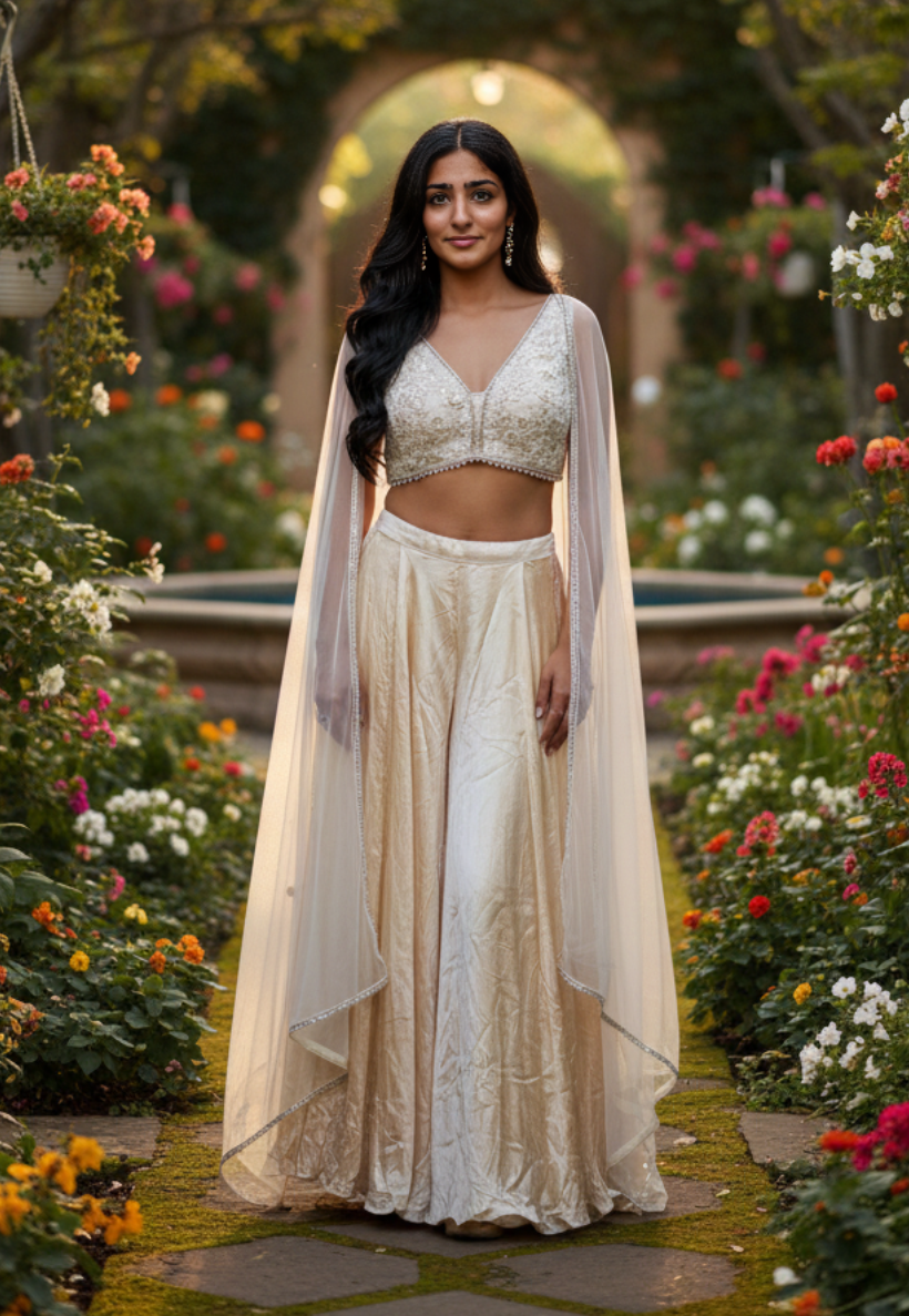 Cream indo western satin silk outfit,sequins,embroidery and beadwork top with palazzo pants and scarf.