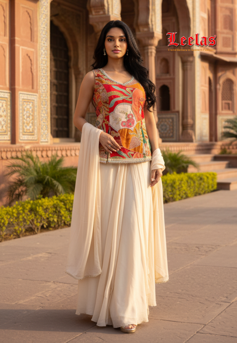 This exquisite silk lengha combines cream, maroon, and green hues in a luxurious ensemble tailored for elegance. The long blouse is richly adorned with intricate sequin, bead, and mirror work, creating a captivating texture and shimmer. Complementing the blouse, cream silk pleated detailing adds refined depth, perfectly paired with a soft cream silk dupatta for graceful draping. Ideal for formal occasions, this lengha exemplifies craftsmanship, balancing traditional artistry with contemporary style.