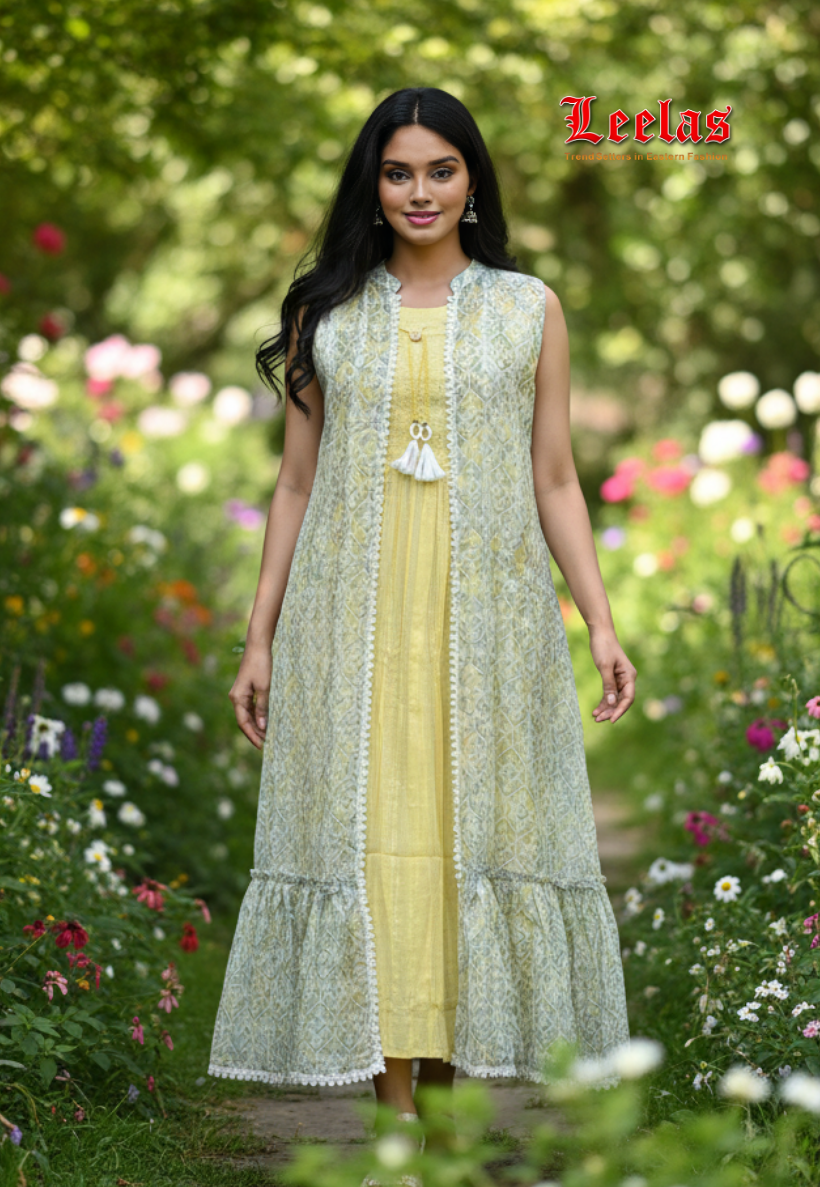 This elegant lemon sleeveless cotton dress offers breathable comfort and a fresh, vibrant look. Paired with a printed green and lemon floral sleeveless jacket, it creates a sophisticated layered style perfect for warm weather occasions. The natural cotton fabric ensures softness and durability, while the floral jacket adds a touch of refined detail, making this ensemble both stylish and versatile. Ideal for those seeking a polished yet comfortable outfit.
