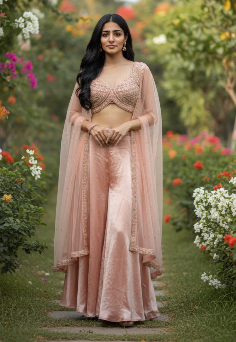 Peach indo western satin outfit with top, pallazzo pants and dupatta.