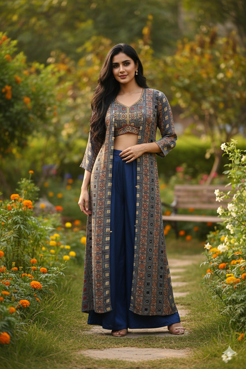 Satin navy blue and maroon abstract print Indo Western long jacket with ready made blouse and plain navy satin pants